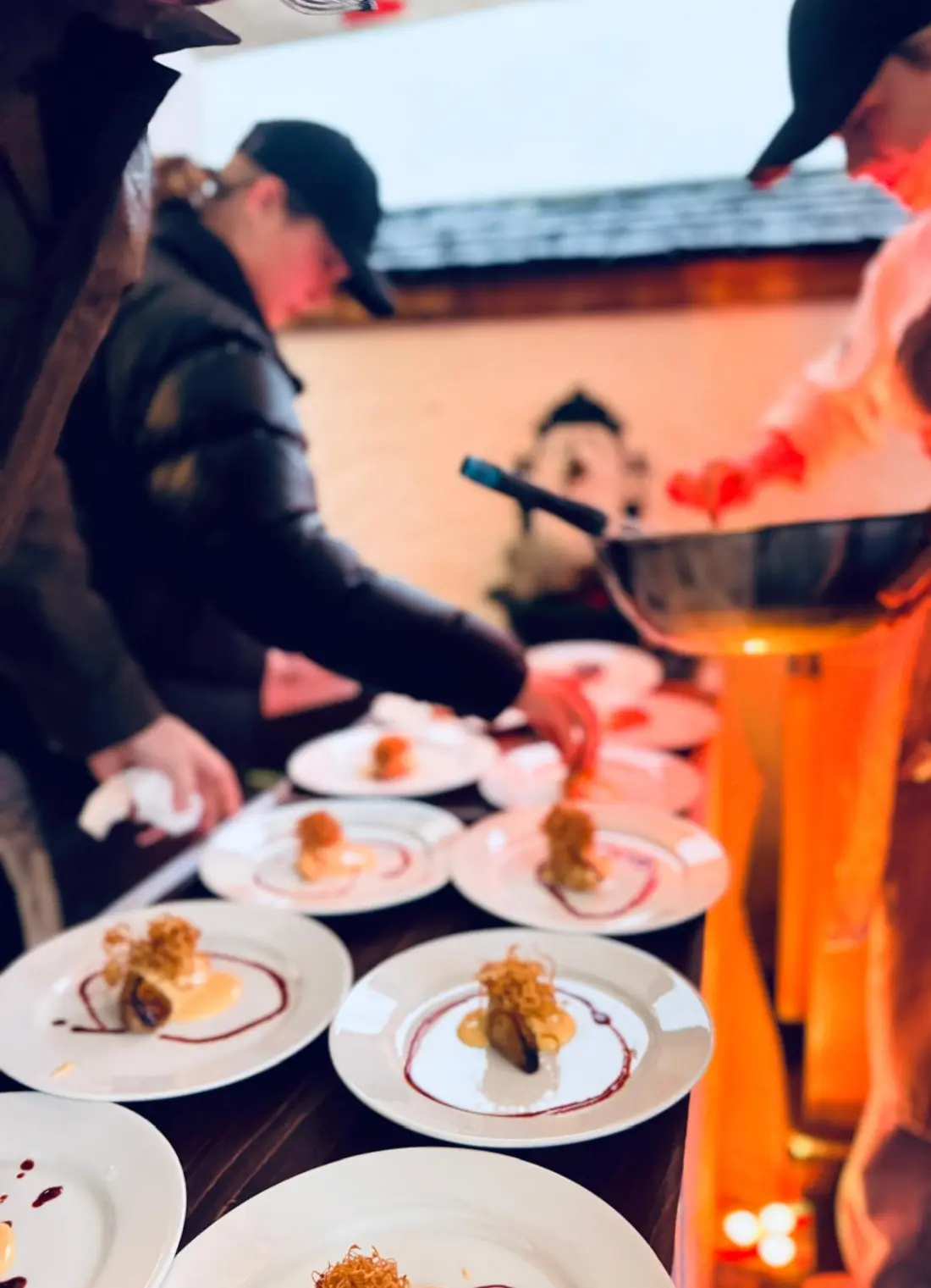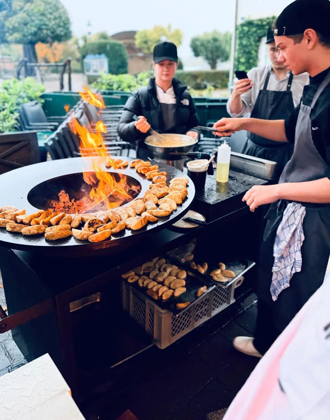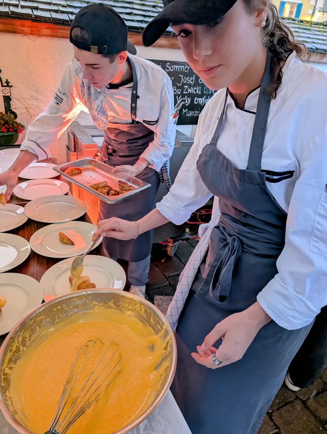 An der Anlegestelle in Strobl verließen die Gäste das Schiff und beeilten sich im Regen zum nächsten Gang: Gegrillter Zeller (Sellerie) mit Nusshollo und Stroh, zubereitet von den SchülerInnen unter Anleitung von Kirchenwirt Josef Schmeisser. Eltern der Talenteschmiedeschüler standen neben der Feuerstelle und beobachteten ihre Kinder stolz bei der Arbeit. Zum Zeller gab es 2023 grünen Veltliner vom Weinviertel DA Reserve Ried aus Schatzberg oder den alkoholfreien gemischten Satz vom Mayer am Pfarrplatz.
