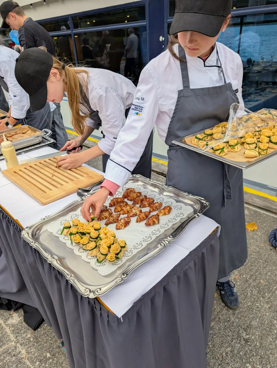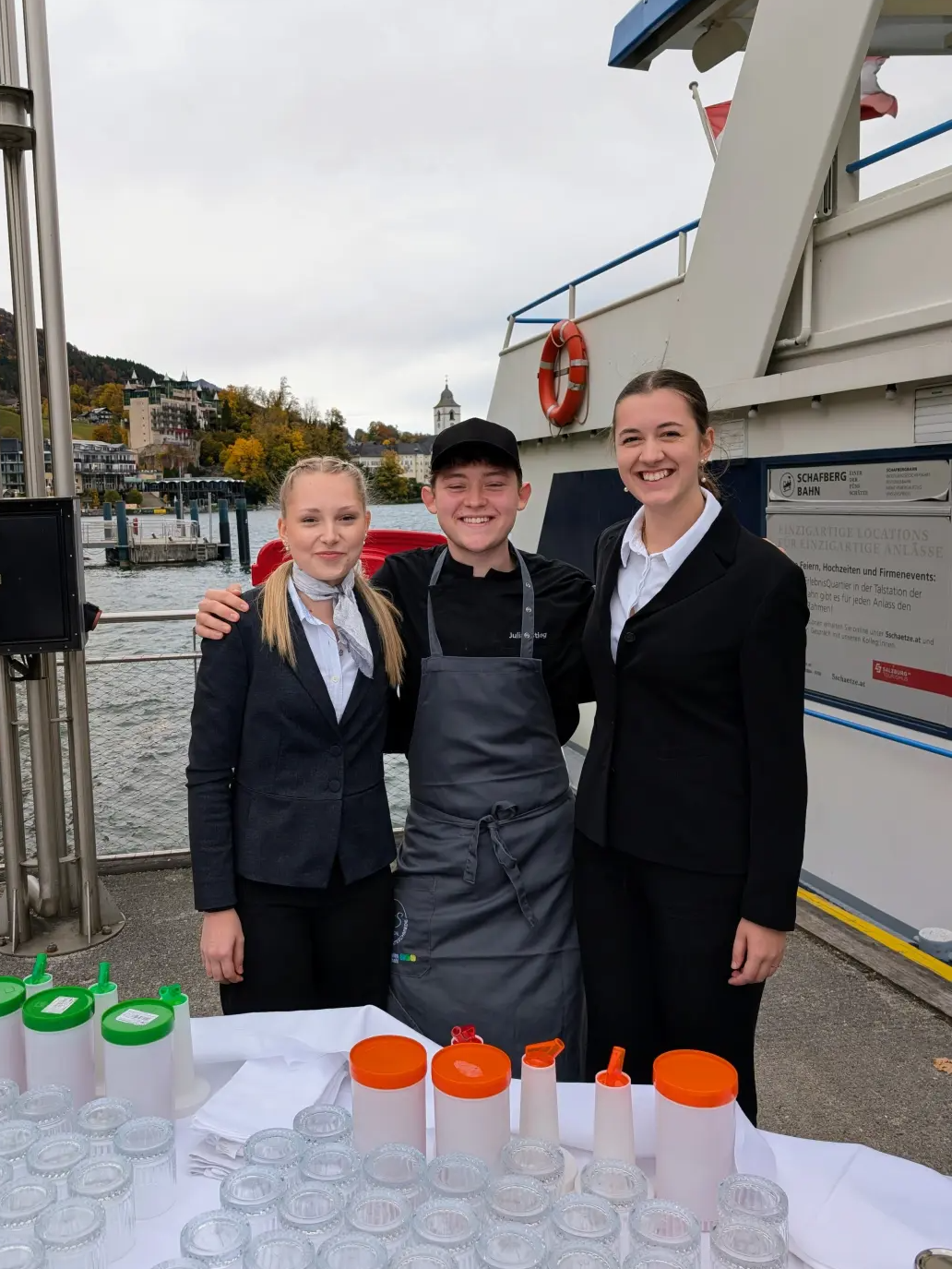 Die Veranstaltung begann an der Schafberg-Anlegestelle, wo die SchülerInnen mit Laugenkipferl, Ox-Tatar, Senf-Knoblauchajoli, Röstzwiebel, Saiblingrilettpalas und Kaviar und Schnittlauch aufwarteten. Dazu gab es Aperol Sour und auch eine alkoholfreie Version stand bereit.