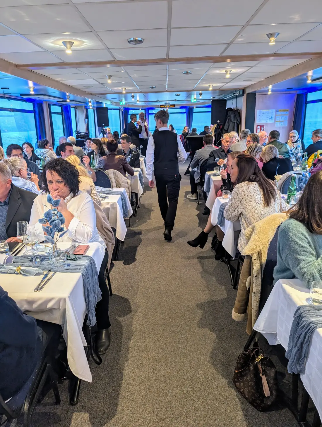 Die Tische am Schiff waren liebevoll gedeckt. Jedes Besteck lag an seinem richtigen Platz, die Gläser standen poliert bereit. Kaum hatten die Gäste Platz genommen, wurde schon eingeschenkt und serviert, und das hörte die nächsten sechs Stunden auch nicht mehr auf. Professor Matthias Praschl moderierte das Programm und beschrieb, welche Köstlichkeiten wir geboten bekamen.